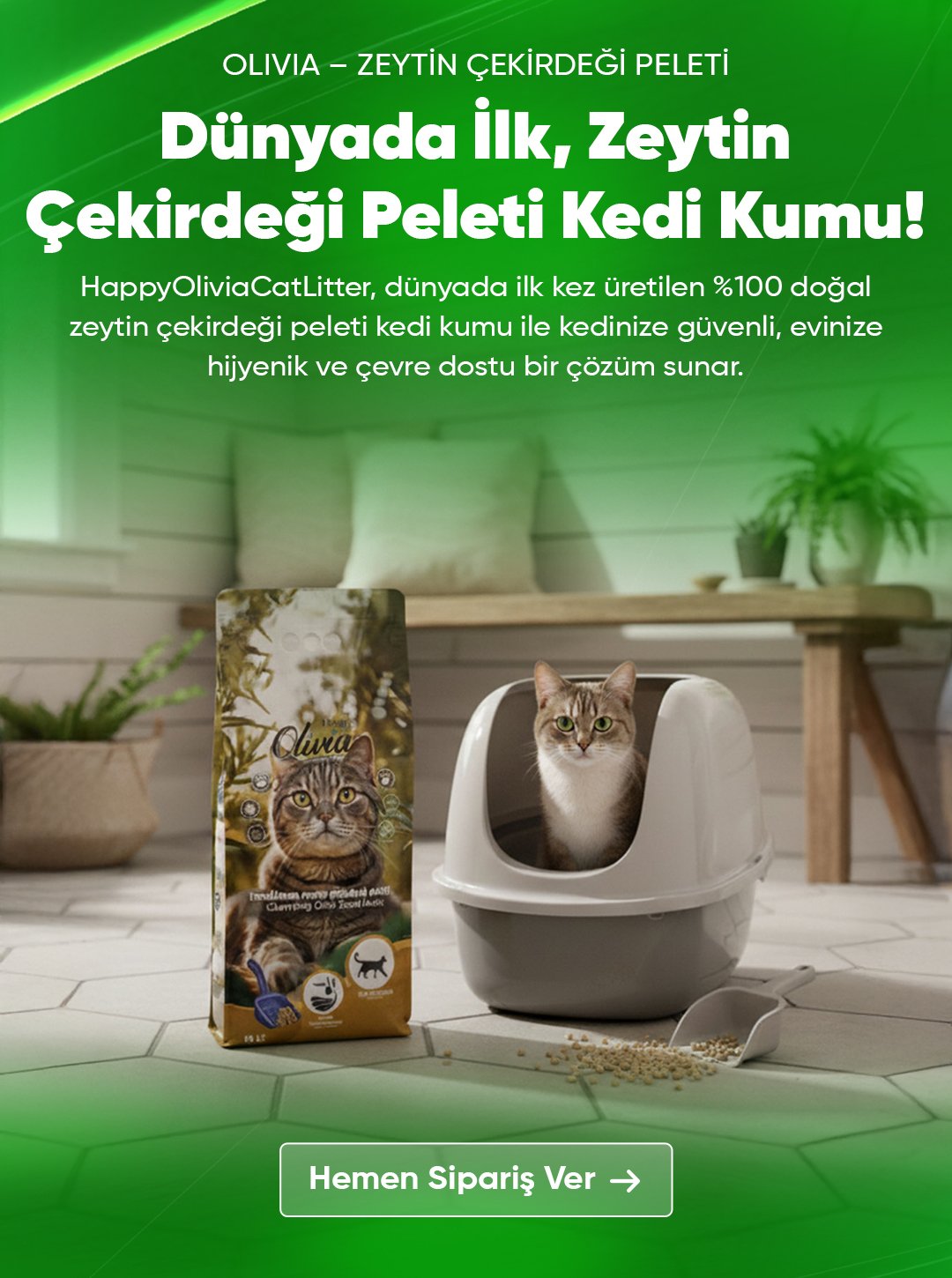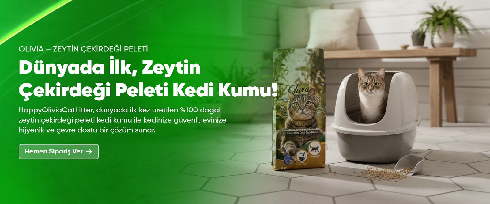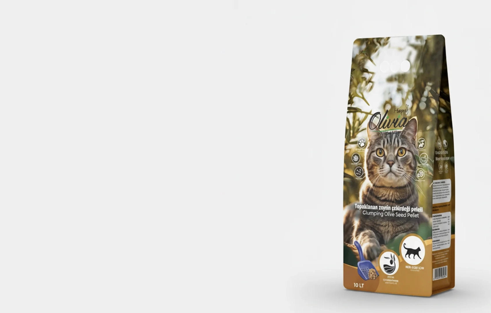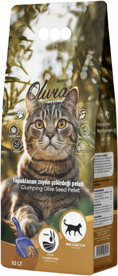 HappyOliviaCatLitter, dünyada ilk kez üretilen %100 doğal zeytin çekirdeği peletinden kedi kumu.